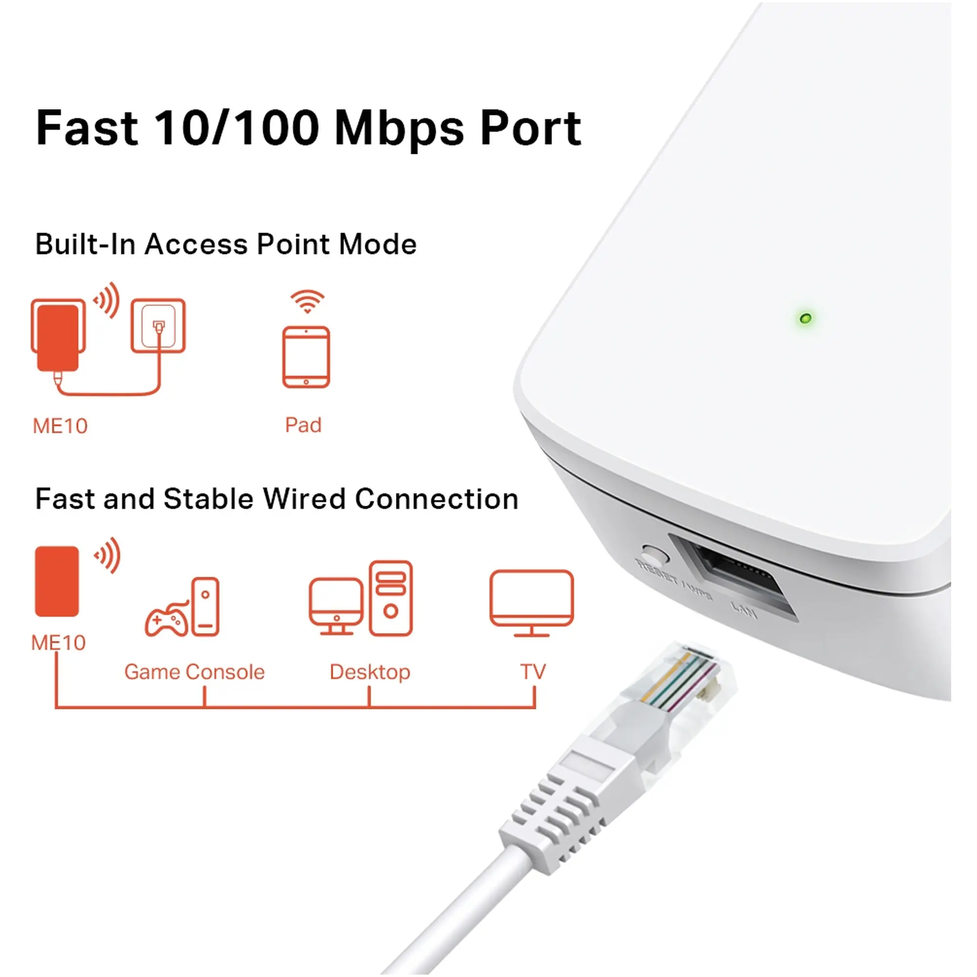 Ретранслятор Mercusys ME10 створено для розширення покриття бездротової мережі та усунення «мертвих зон», де звичайний маршрутизатор не справляється. Він працює у діапазоні 2,4 ГГц за стандартом IEEE 802.11n (Wi-Fi 4) і забезпечує швидкість до 300 Мбіт/с, що робить його зручним для перегляду відео, веб-серфінгу та онлайн-ігор у місцях зі слабким сигналом. Пристрій підтримує режим підсилювача сигналу та може працювати як точка доступу при дротовому підключенні через порт Ethernet 10/100 Мбіт/с.
