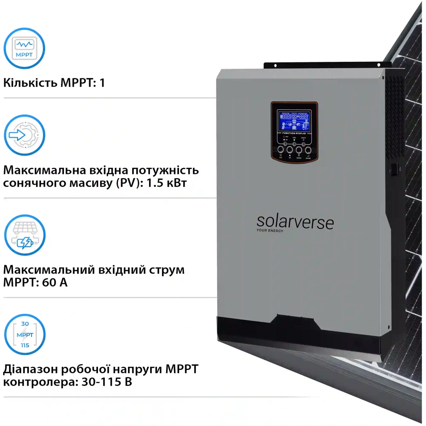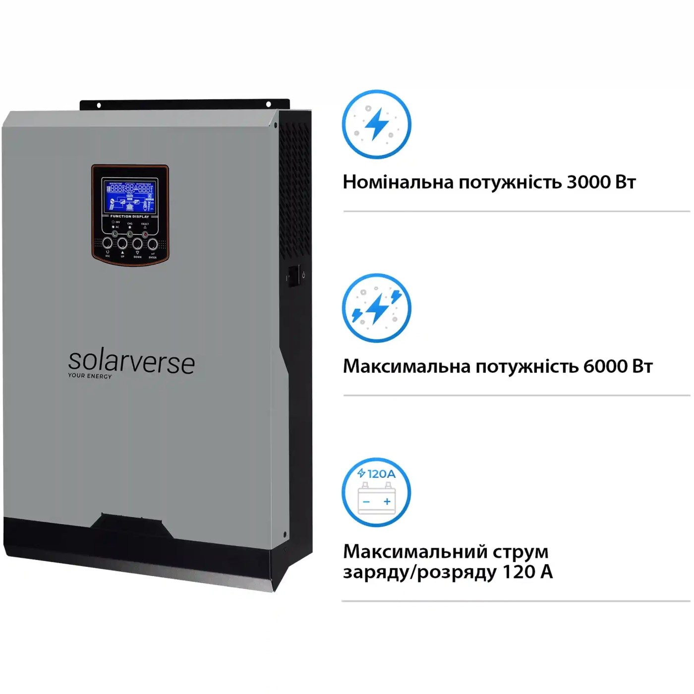 Інверторний блок SV3024A забезпечує чисту синусоїду — а це означає, що всі ваші пристрої, від холодильника до комп’ютера, працюють тихо та безпечно. Сумарна потужність 3000 Вт і можливість підключення сонячного масиву до 1.5 кВт роблять систему ідеальною для побутового та комерційного використання. Один MPPT-контролер гарантує ефективну роботу із сонячними панелями, а вбудовані алгоритми інтелектуального керування захищають батарею від перевантаження та перерозряду. Solarverse — це синтез технологій, які дбають про вас і ваш комфорт.