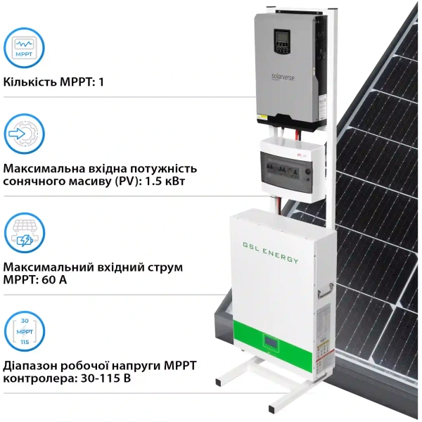 У порівнянні з традиційними свинцево-кислотними рішеннями LiFePO4 (модель GSL025200A-B-GBP2) забезпечує до 6500 циклів — це роки стабільної роботи без «просідання» ємності. На відміну від побутових ДБЖ і генераторів, Solarverse автономна та екологічна: без вихлопів, без бензину, без шуму. Один MPPT-контролер із вхідною потужністю PV до 1.5 кВт розширює сценарії використання: удень заряджає батарею від сонячного масиву й знижує рахунки, а вночі — живить накопичене.