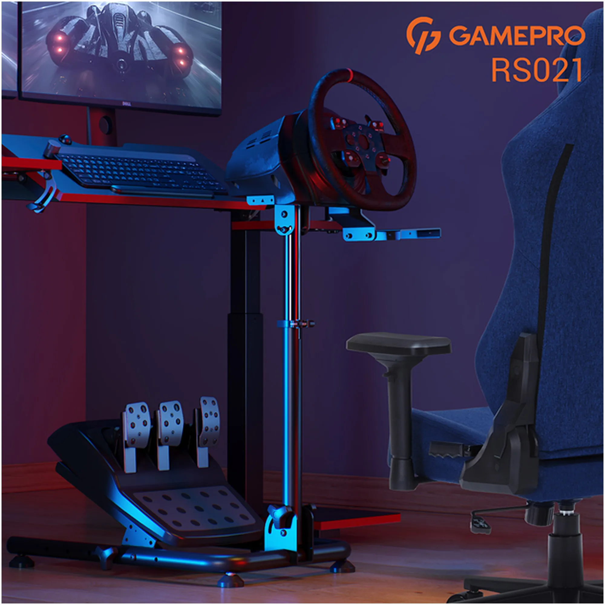Конструкція Gamepro RS021 виконана з міцної сталевої рами, здатної витримувати інтенсивне використання і динамічні рухи під час віртуальних гонок. Сталь не тільки забезпечує довговічність, але і додає стійкості всій конструкції — стенд не ковзає і не розхитується при активних поворотах керма або натисканнях на педалі. При цьому компактний дизайн зберігає зручну відстань між екраном, кермом і сидінням, створюючи правильну ергономіку, необхідну для повного занурення в ігровий процес.