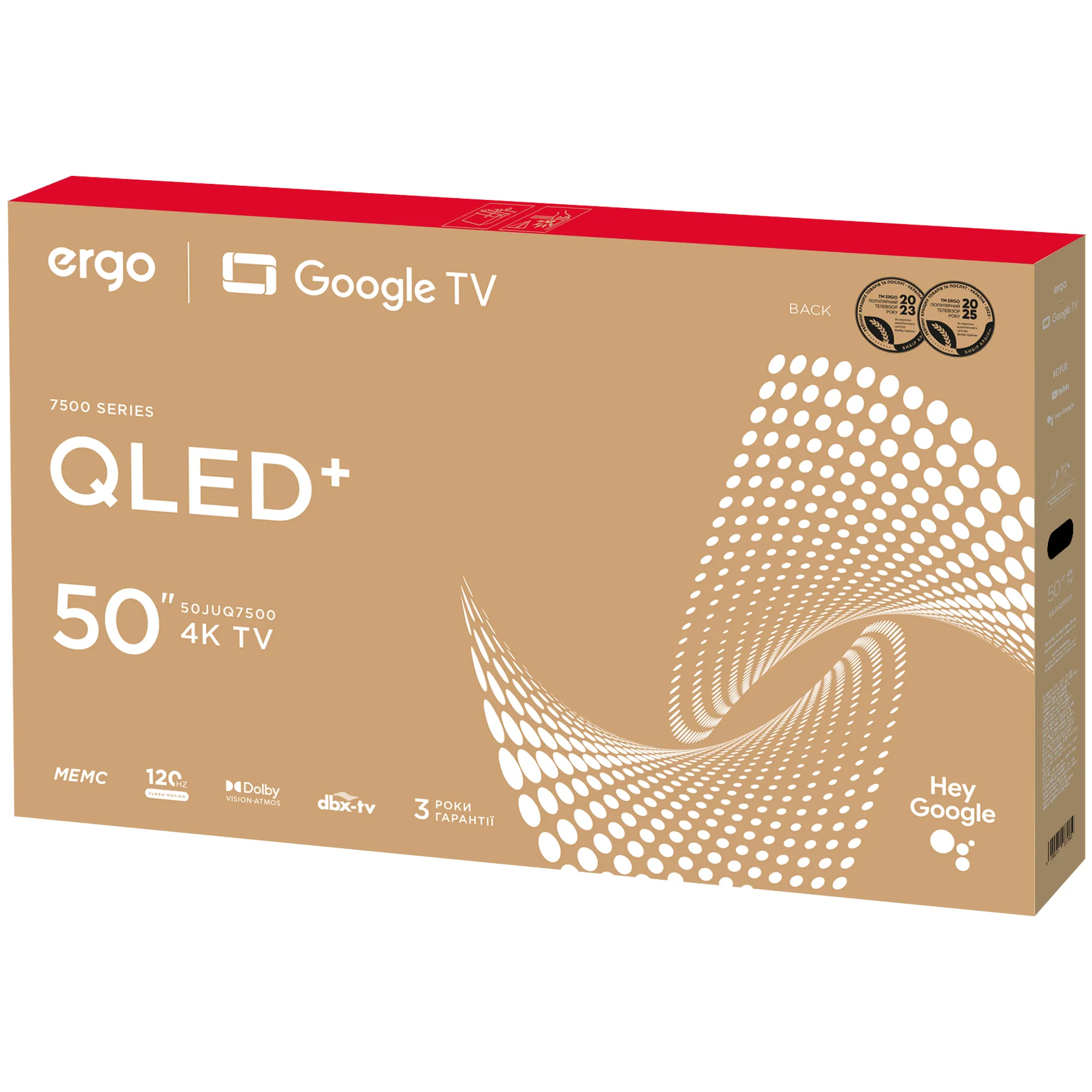 Одна з ключових особливостей моделі ERGO 50JUQ7500 — це інтеграція технологій Dolby Vision та Atmos, які виводять якість зображення та звуку на новий рівень. Dolby Vision забезпечує розширений динамічний діапазон і значно покращує контрастність, роблячи темні сцени глибшими, а світлі — більш сліпучими. В той час Dolby Atmos створює об'ємний звук, занурюючи глядача в центр подій і створюючи ефект присутності, що підсилює емоційне сприйняття контенту.
