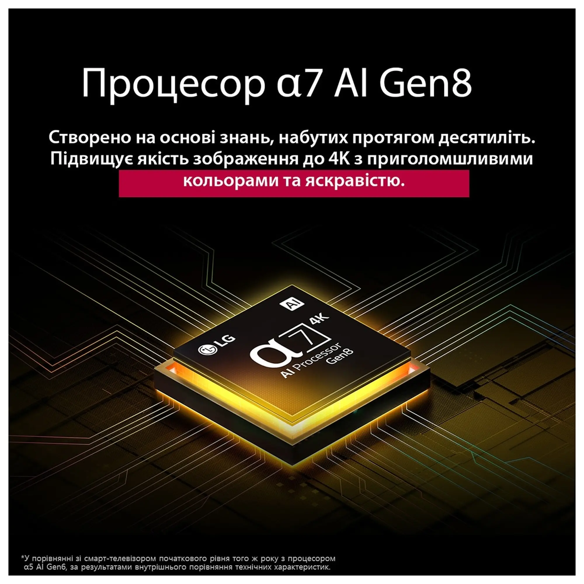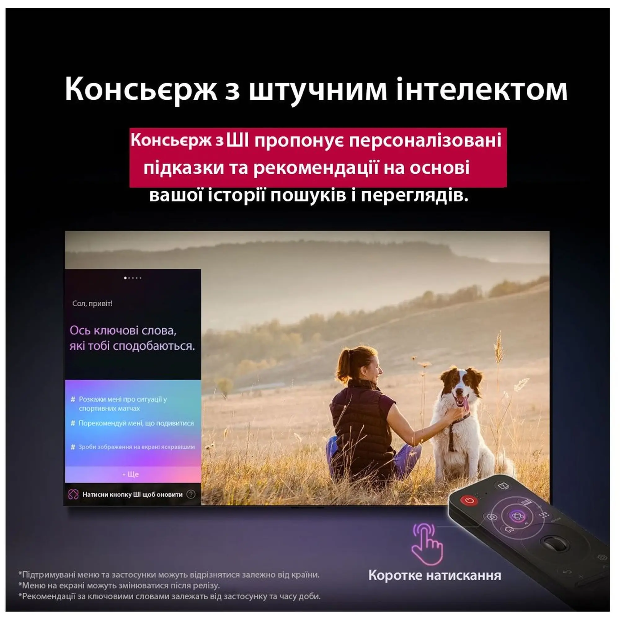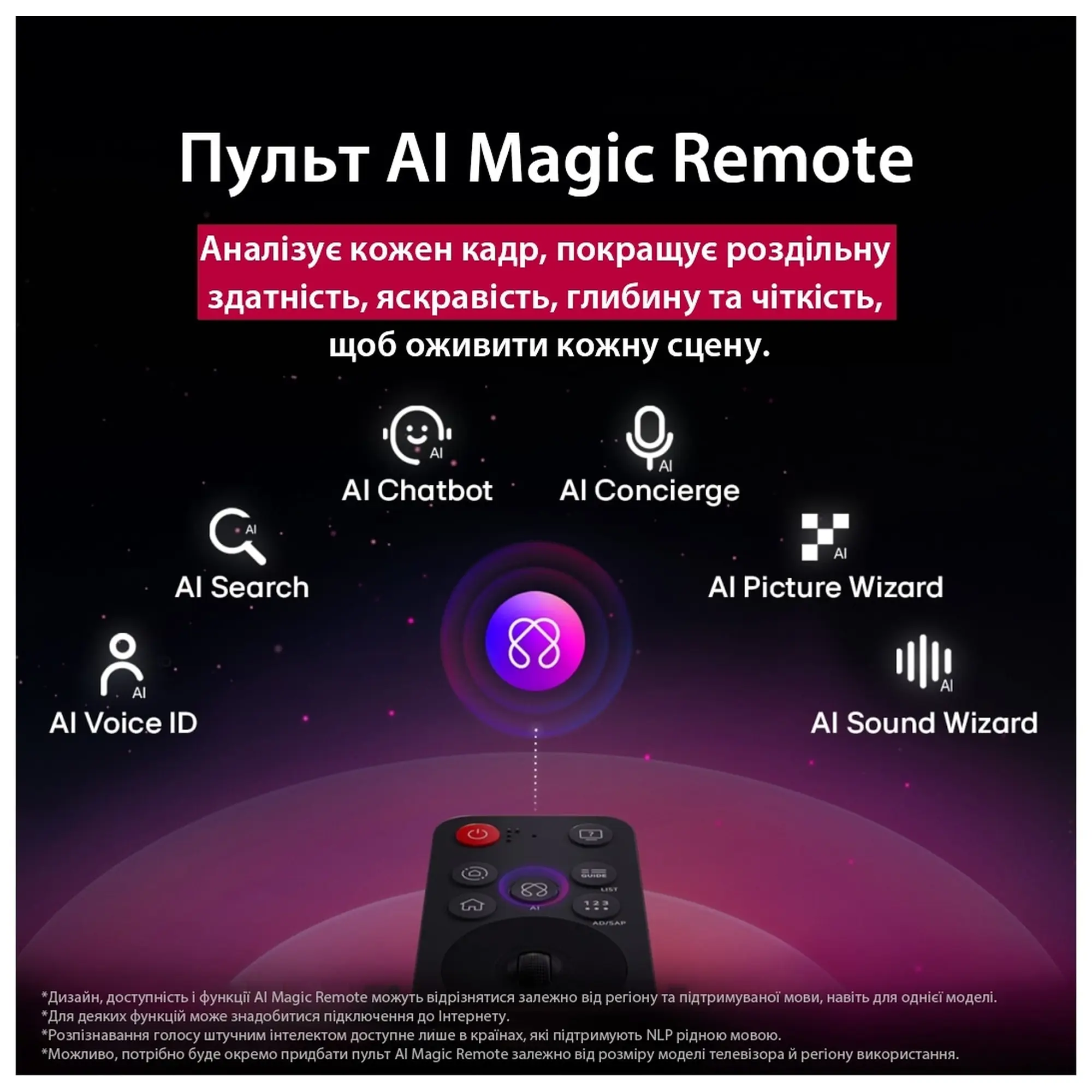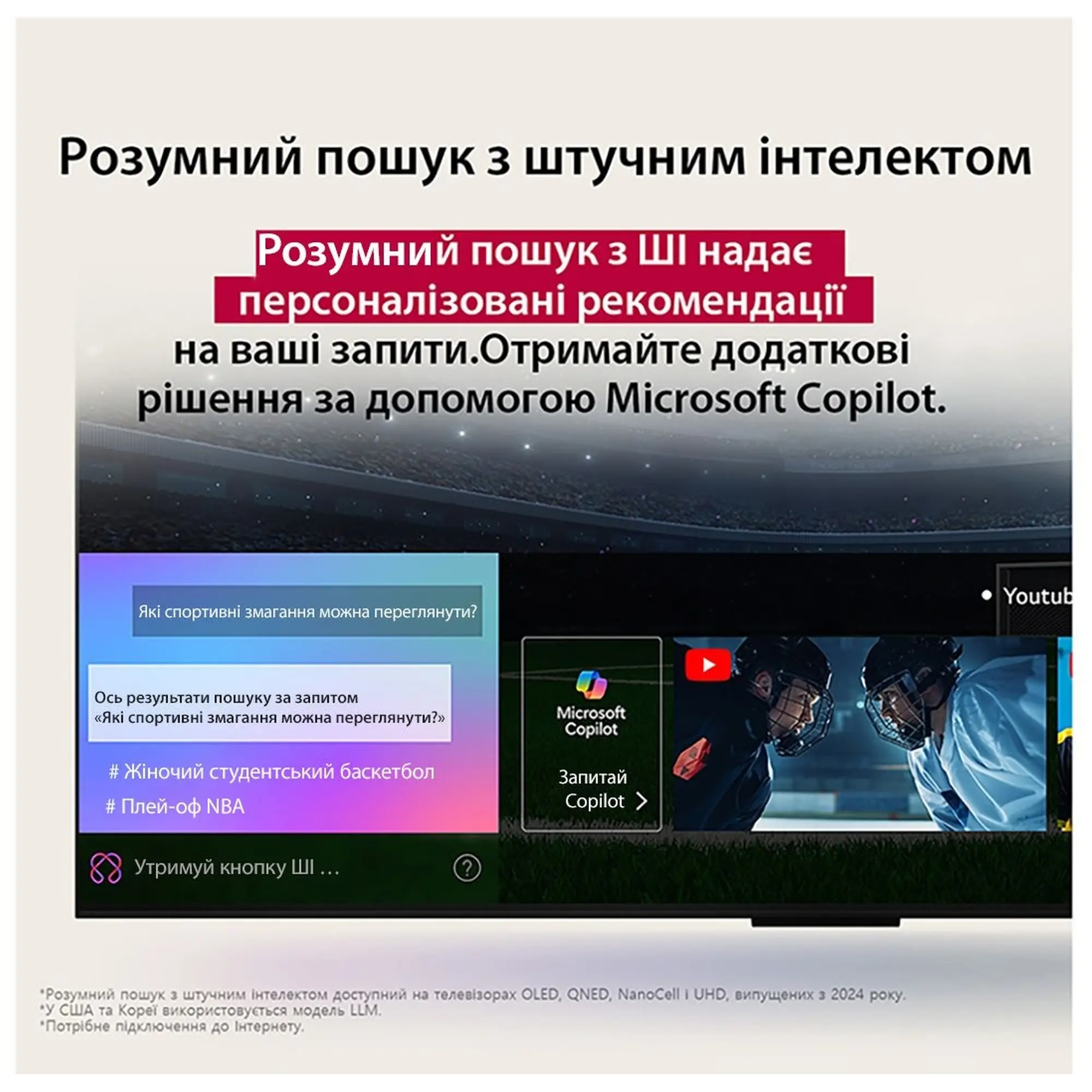 Інтелектуальна система на базі webOS відкриває доступ до численних застосунків, потокових сервісів та онлайн-кінотеатрів. Керування телевізором зручне та інтуїтивне, а завдяки підтримці голосових команд і смарт-пульта взаємодія з пристроєм стає ще простішою. Звук із технологією AI Sound створює ефект об’ємного звучання, наповнюючи кімнату реалістичними аудіодеталями та підсилюючи враження від перегляду.