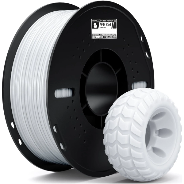 TPU Filament для 3D принтера ELEGOO, представлений у білому кольорі, є ідеальним вибором для створення гнучких і міцних об'єктів. Цей філамент з діаметром 1.75 мм і вагою 1 кг володіє унікальними властивостями еластичності та міцності. Він може розтягуватися до п'яти разів від своєї початкової довжини, що дозволяє створювати об'єкти, здатні витримувати значні механічні навантаження без ризику розриву. Висока твердість Shore 95A робить його ідеальним для друку функціональних деталей і прототипів, які потребують гнучкості та стійкості.