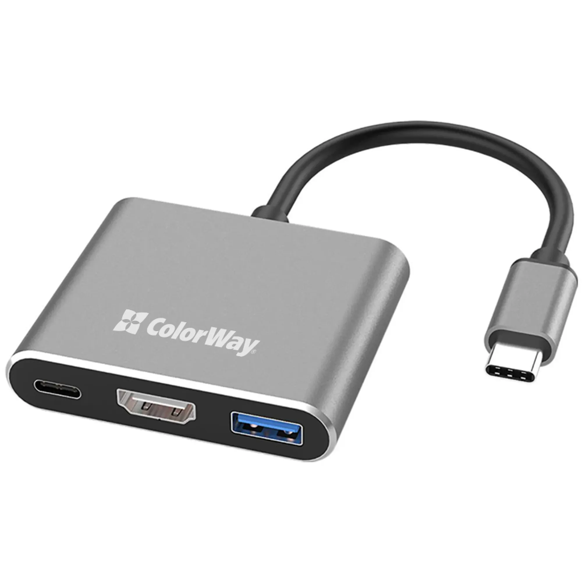 USB-хаб ColorWay 3в1 USB-C - 1USB3.0+USB-C PD100W+HDMI 4К Grey (CW-HUB08)