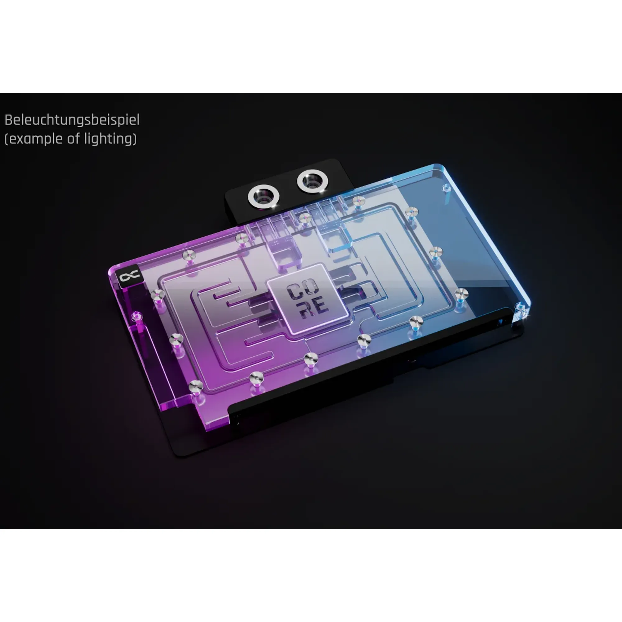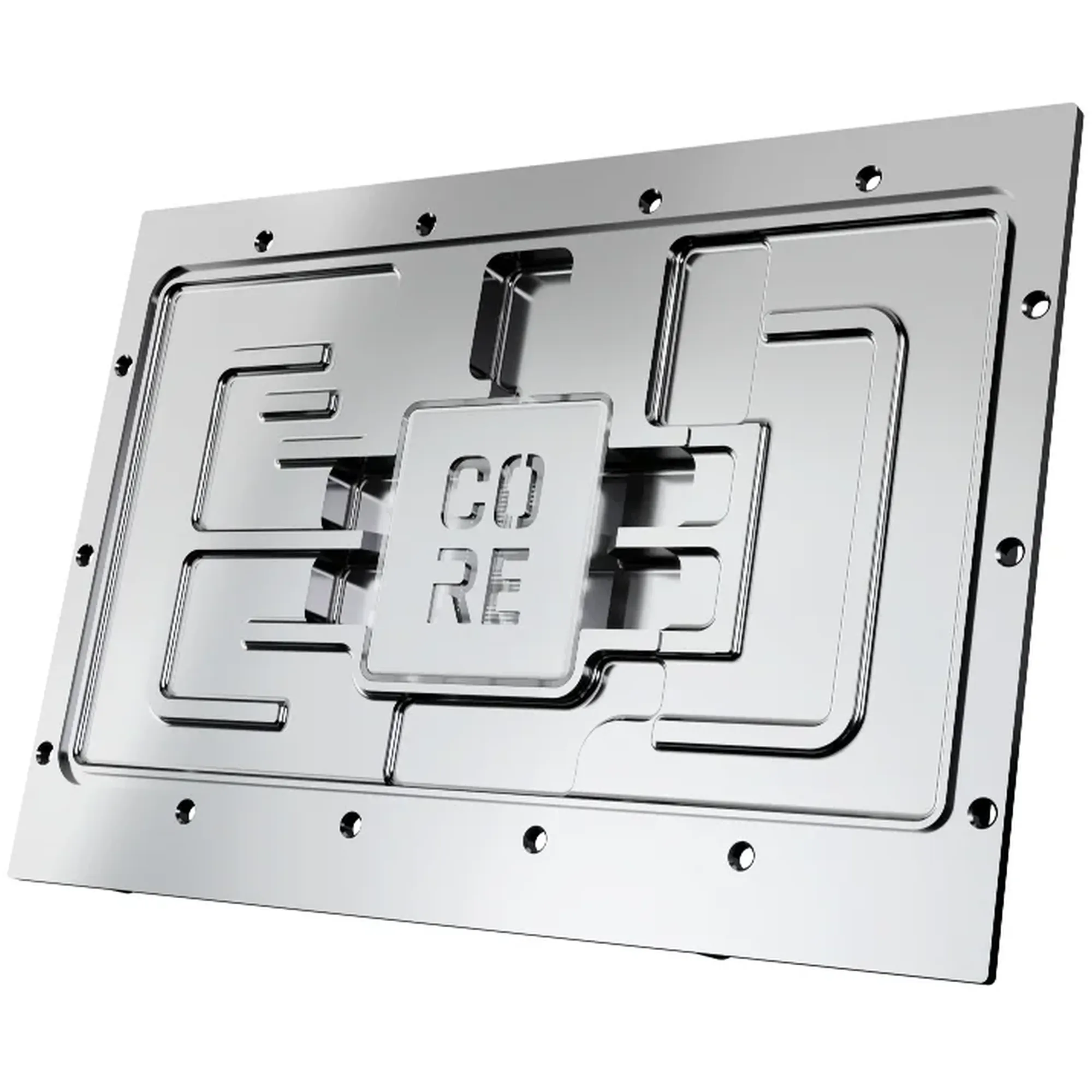 Основою конструкції є суцільний мідний блок з хромованим покриттям, яке не лише збільшує його довговічність, але й надає пристрою стильний зовнішній вигляд. Латунний термінал і нейлоновий кожух доповнюють конструкцію, забезпечуючи її міцність та стійкість до механічних пошкоджень. Особливої уваги заслуговує акрилова кришка з рівномірним aRGB-підсвічуванням, яка додає естетичну привабливість і дозволяє користувачам налаштувати зовнішній вигляд системи відповідно до їхніх вподобань. Логотип Core і латунні фітинги завершують дизайнерську концепцію, підкреслюючи високу якість і увагу до деталей.